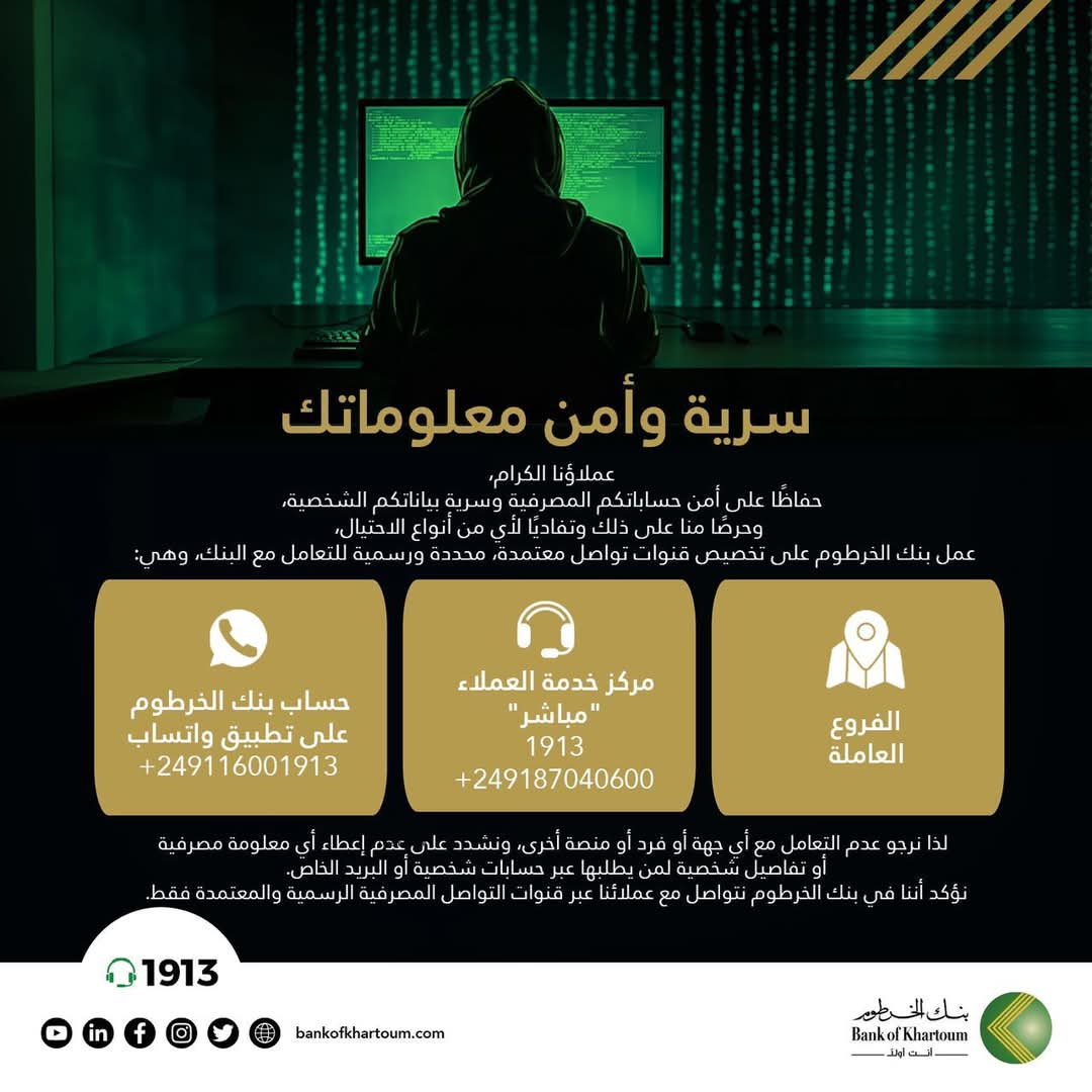 متابعات _ الهدهد نيوز _ في إطار حرص بنك الخرطوم على تحسين مستوى خدماته وتلبية احتياجات عملائه بشكل أفضل، أعلن البنك مؤخرًا عن تدشين رقم واتساب مخصص يعمل على مدار 24 ساعة لتقديم الدعم الفني وخدمة العملاء لمستخدمي تطبيق “بنكك”. يأتي هذا الإجراء ضمن استراتيجية البنك لتعزيز التواصل المباشر مع العملاء، وضمان حصولهم على الدعم السريع والفعال في مختلف الأوقات، سواء كانوا داخل السودان أو في الخارج.